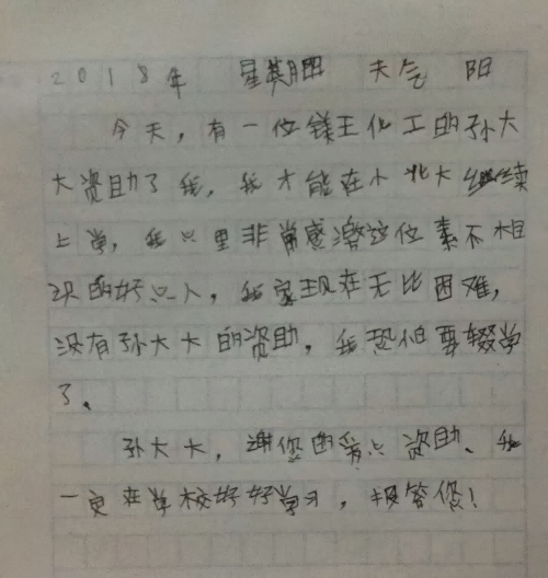 當(dāng)年8月份,紀(jì)某某和賈某某兩位學(xué)生分別以?xún)?yōu)異的成績(jī)考入石家莊鐵道學(xué)院和河北工程技術(shù)學(xué)院。因家庭收入過(guò)低,無(wú)法支付昂貴的學(xué)費(fèi),家人一籌莫展,得知情況后,孫文董事長(zhǎng)慷慨解囊,分別給予紀(jì)某某10000元、賈某某6000元的資助。受助家長(zhǎng)激動(dòng)地說(shuō),真不知道怎么感謝董事長(zhǎng)的恩情,兩位學(xué)生表示,一定不辜負(fù)孫文董事長(zhǎng)的愛(ài)心和厚望,努力學(xué)習(xí),用優(yōu)異的成績(jī)回報(bào)社會(huì)。